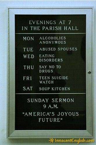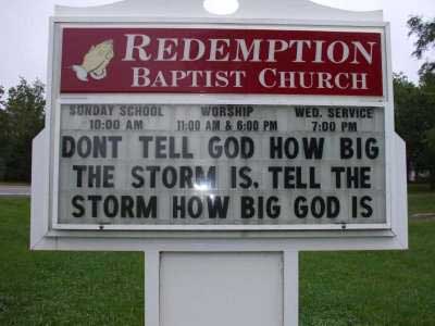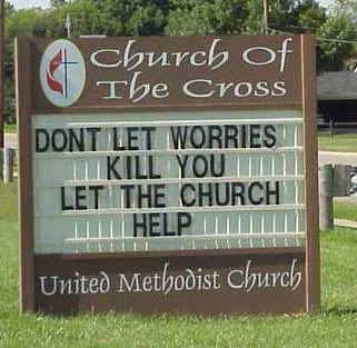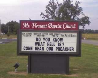 I collected these pictures of church signs from all over the Web. It's possible that one or two of the photos are fake, but each appears to be real. A few may be attempts at humor. I myself did not modify the messages. Note that these signs are not only from "fundamentalist" churches, but from many old and established sects as well.