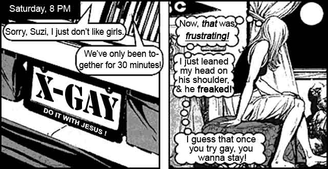| Pity anyone who read the original, "That Crazy Guy!" and believed it. Susan presumably used the condoms that Ms. Damien gave her, but her single experience of sex gave her gonorrhea and AIDS! (I seem to recall that when that tract was updated some years back, Chick gleefully added AIDS.) And the doctor's comments are devastatingly cruel, as bad in the original as in the spoof.